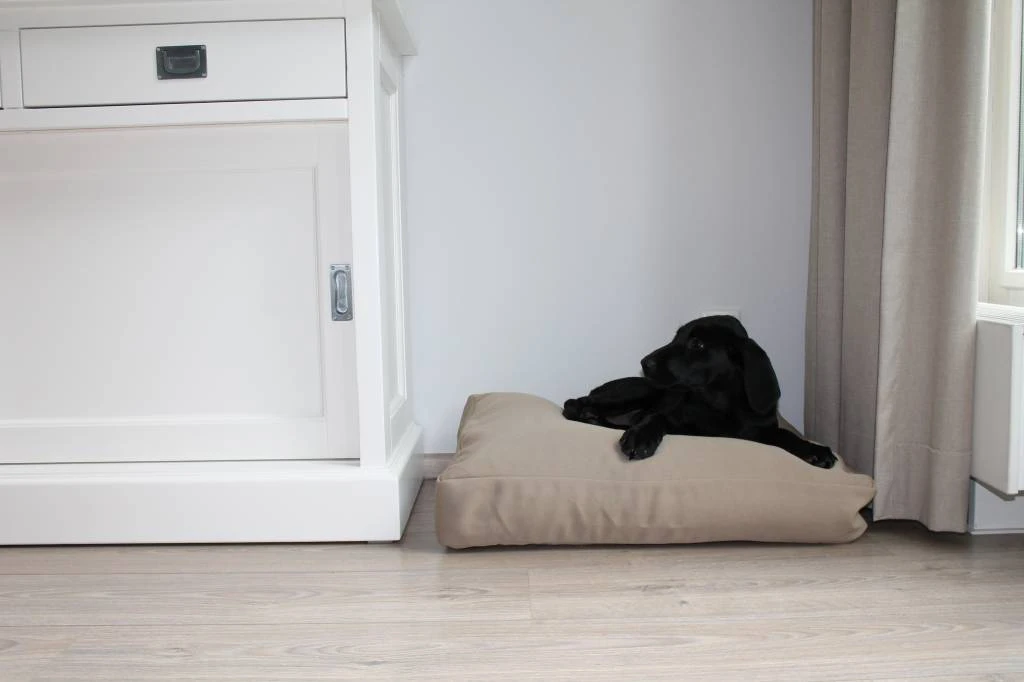 Een mooi hondenbed bestaande uit een binnenbed gevuld met EPS parels en een beige buitenhoes. De EPS parels zorgen ervoor dat de hond comfortabel in de bench kan liggen.