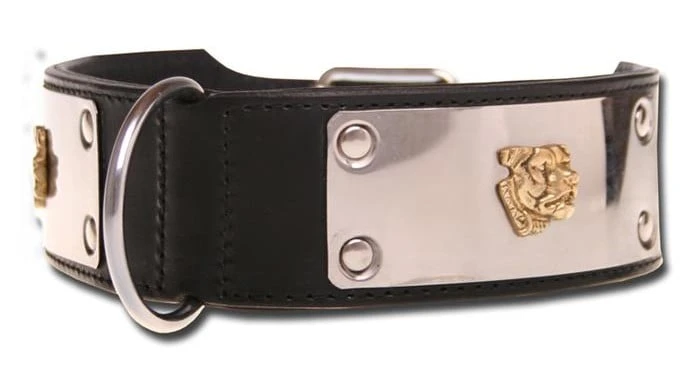 Hondenhalsband Dogs of Steel, Deze zwarte hondenhalsband is gemaakt van dubbellaags leer. De versiering op de halsband is opvallend: aan beide zijden een hondenkop op een roestvrijstalen plaatje. Er is ook een bijpassende hondenriem. Bepaal de juiste maat voor uw hond: meten is weten Leverbaar in de volgende maten: Maat Nekomvang Breedte XS 40 – 43,5 cm 40 mm S 44 – 48,0 cm 40 mm M 48 – 52,5 cm 40 mm L 44 – 48,0 cm 60 mm XL 48 – 52,5 cm 60 mm XXL 53 – 58,0 cm 60 mm XXXL 58 – 62,0 cm 60 mm
