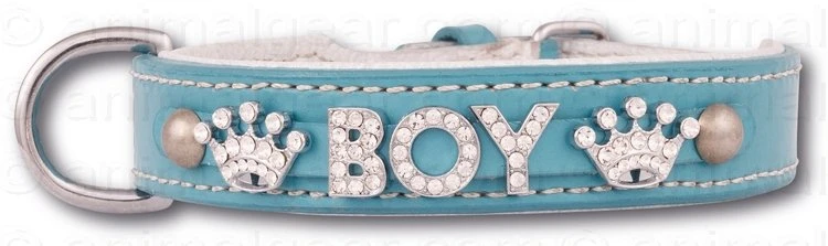 Hondenhalsband met naam Medium Babyblue Deze blauwe halsband is gemaakt van dubbellaags leer en is gevoerd met kalfsleer. Wat is er leuker dan een mooie leren halsband met de naam van uw huisdier in fraaie strass letters op de halsband ? Een echt uniek exemplaar voor uw hond, waarmee u en uw hond zeker op zullen vallen ! Op deze hondenhalsband is er plaats voor een naam van maximaal 7 letters. De letters worden door ons op de halsband geplaatst ! Als u een decoratief element toe wilt voegen (een kroontje of een pootje), kunt u per element 2 letters minder plaatsen daar deze elementen ongeveer tweemaal zoveel plaats innemen als een letter. Een kroontje of een pootje dient u apart toe te voegen aan uw bestelling. Losse letters of de halsband zonder letters zijn apart te bestellen, neemt u daarvoor even contact met ons op. Let op dat u in het vakje ‘naam van de hond’ de naam invult, anders kan de bestelling niet worden afgerond. Deze halsband is verkrijgbaar in de volgende maten: Bepaal de juiste maat voor uw hond :