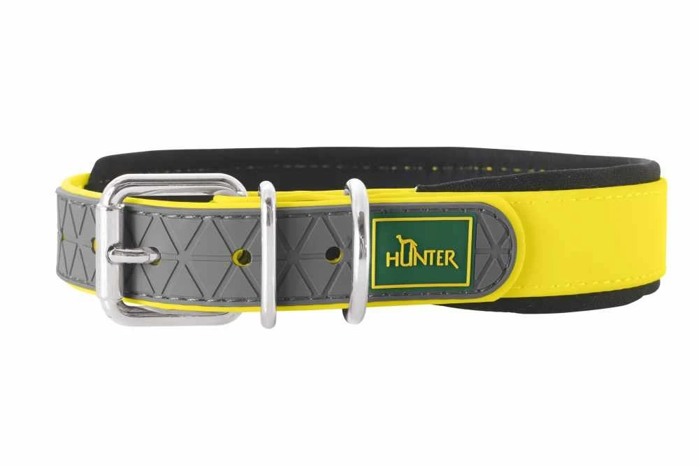 Hondenhalsband Convenience Comfort Geel Deze strakke halsband is gemaakt van stevig kunststof en is door de strakke vorm en de grote keuze aan kleuren geschikt voor elke smaak. Het onderhoudsvriendelijke materiaal maakt deze mooie halsband absoluut geschikt voor dagelijks gebruik. Het speciaal door Hunter ontwikkelde kunststof is bestand tegen scheuren, duurzaam en waterbestendig. Voor extra comfort voor de hond, is de halsband gevoerd met zacht neopreen. U kunt de halsband gewoon met water afspoelen als de halsband vies is geworden. De kunststof is vergelijkbaar met Biothane® en heeft de volgende eigenschappen: Duurzaam Sterk Vrijwel onderhoudsvrij Kleurvast Vochtwerend Beschimmelt niet Neemt geen vocht op Scheurt niet Simpel te reinigen met water Behoudt de vorm Bijna slijtvrij Kleur: neon geel Bepaal de juiste maat :